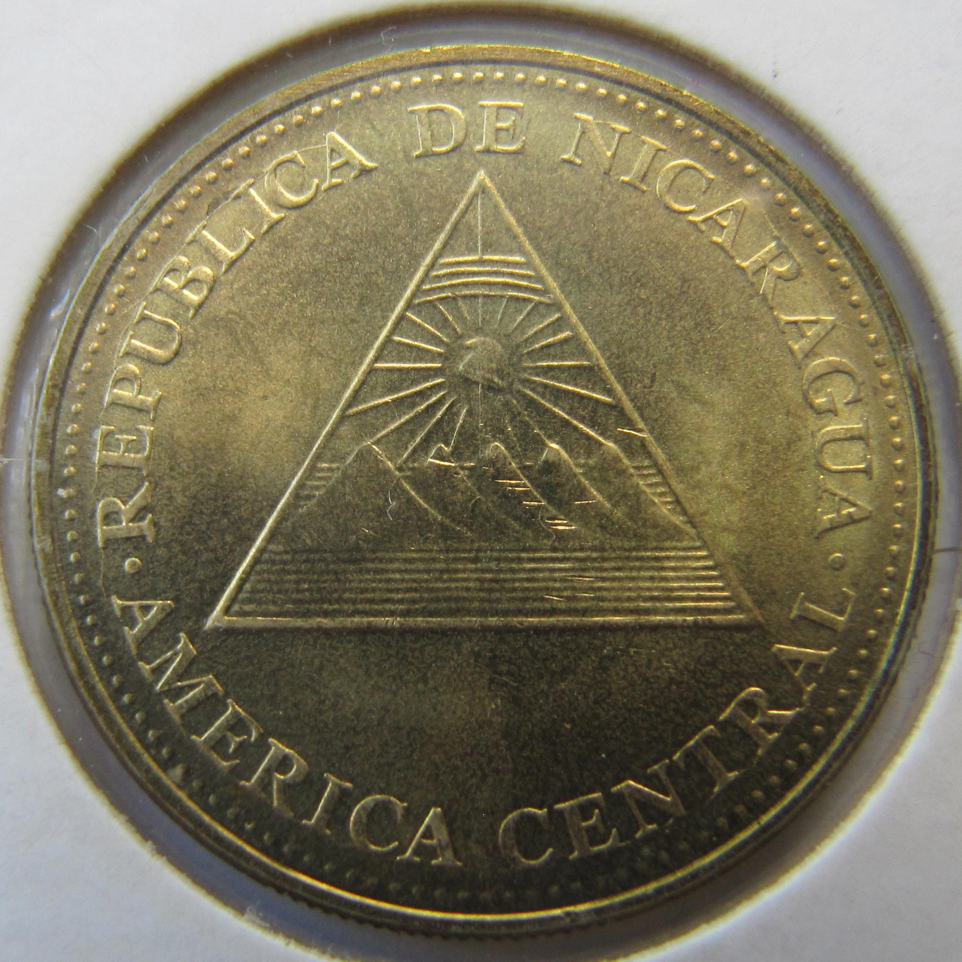 Реверс:герб Никарагуа, сверху надпись: REPUBLICA DE NICARAGUA, снизу: AMERICA CENTRAL.