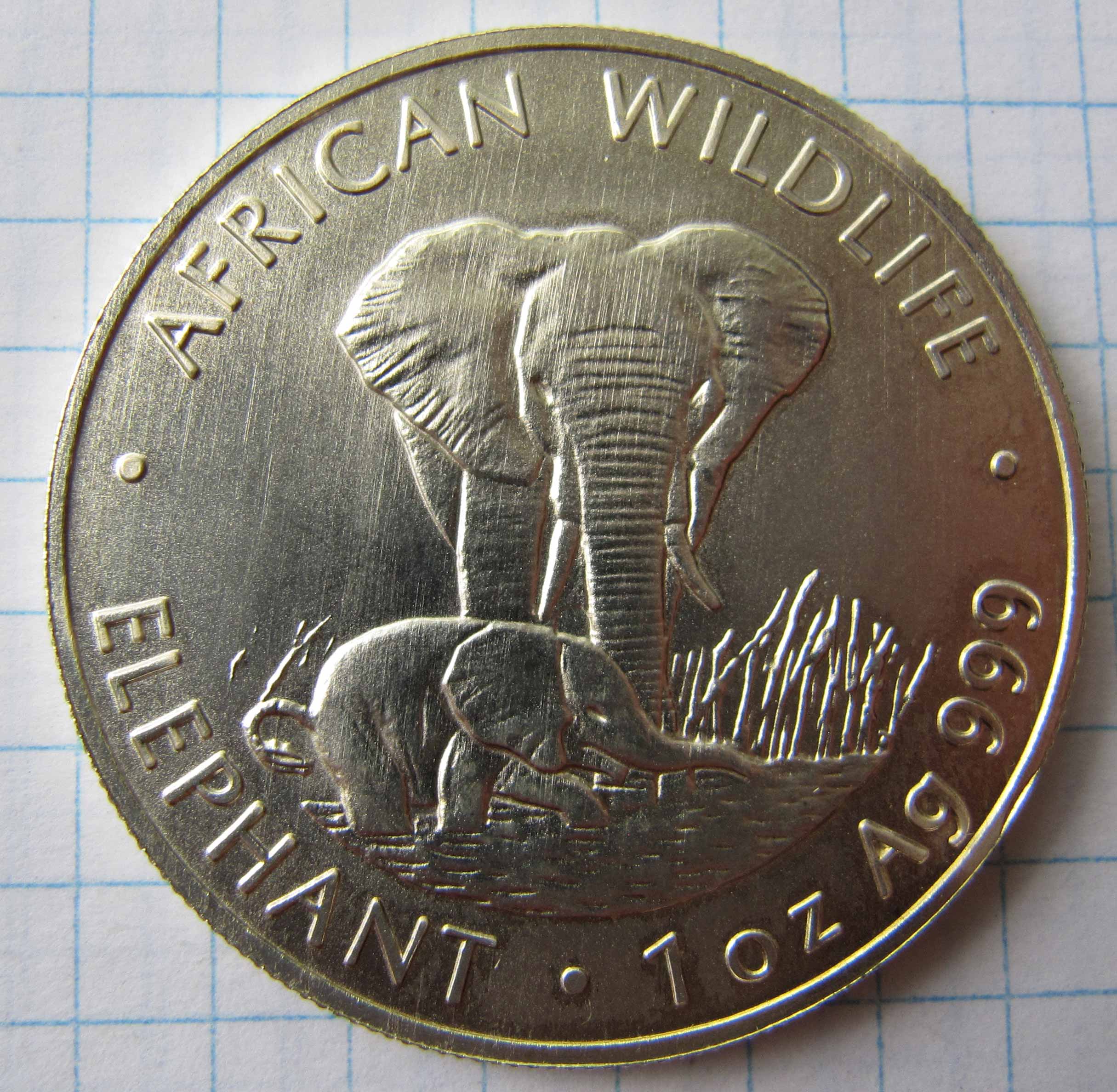 Реверс:слон зі слоненятком, по колу написи: AFRICAN WILDLIFE та ELEPHANT, а також вага та якість металу.
