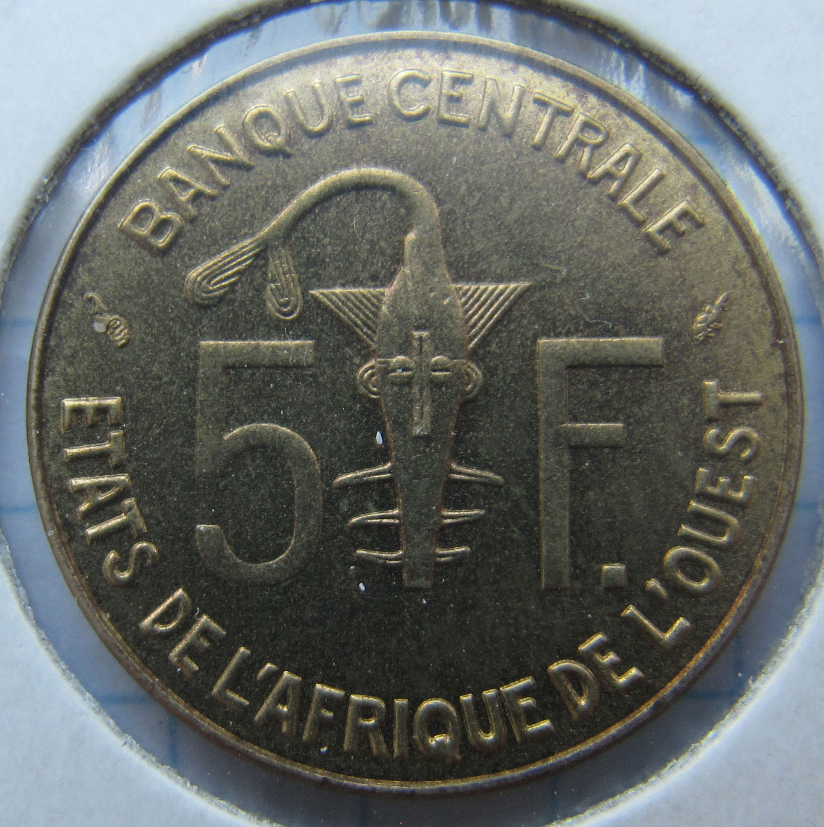 Аверс:номінал 5F та золота гиря ашанті, що служила для зважування золотого піску. По колу напис: BANQUE CENTRALE ÉTATS DE L'AFRIQUE DE L'OUEST.