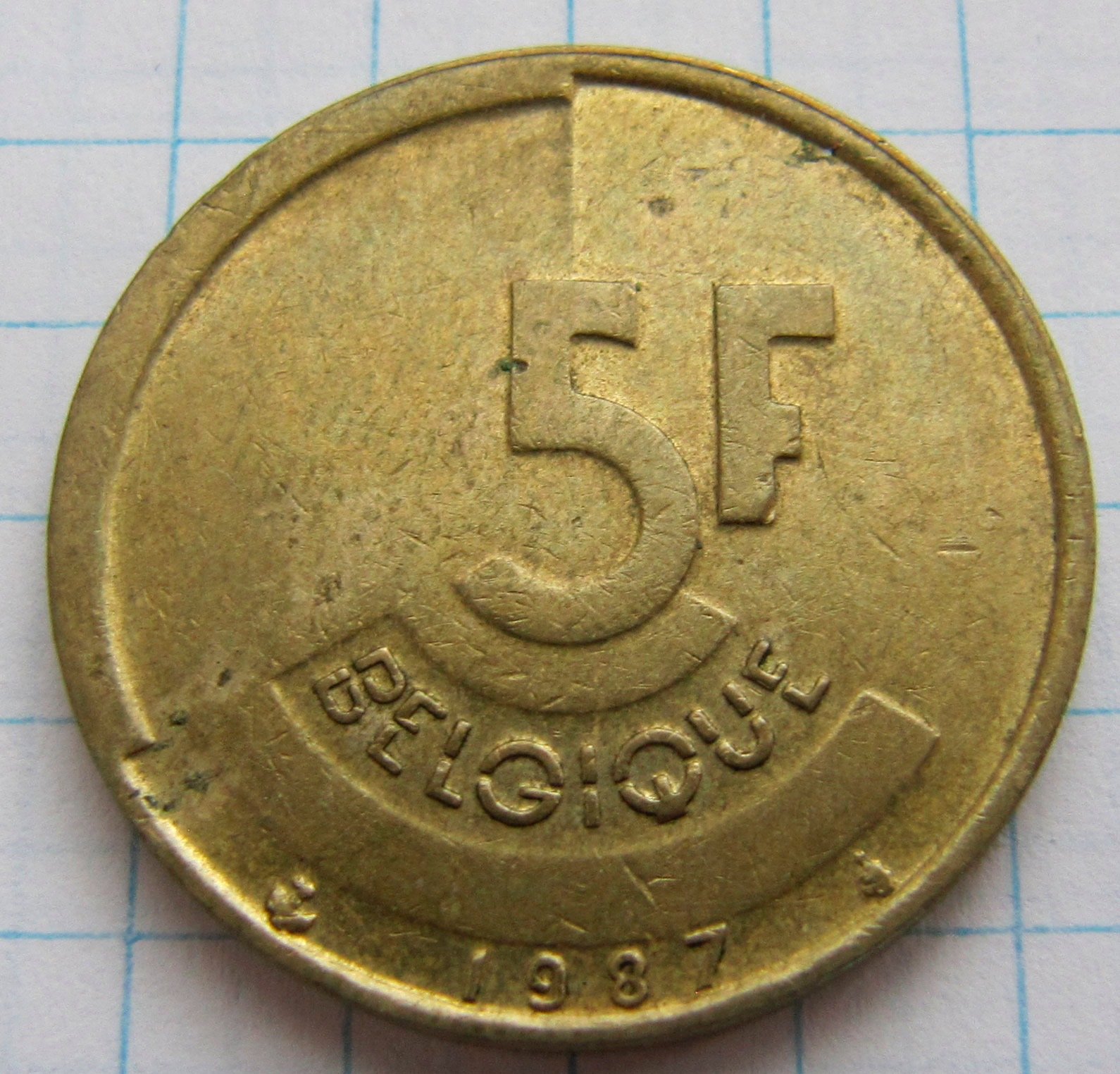 Аверс:поле монеты разделено на три части. Номинал 5 F, ниже надпись на французском языке: BELGIQUE, еще ниже - год чеканки монеты.