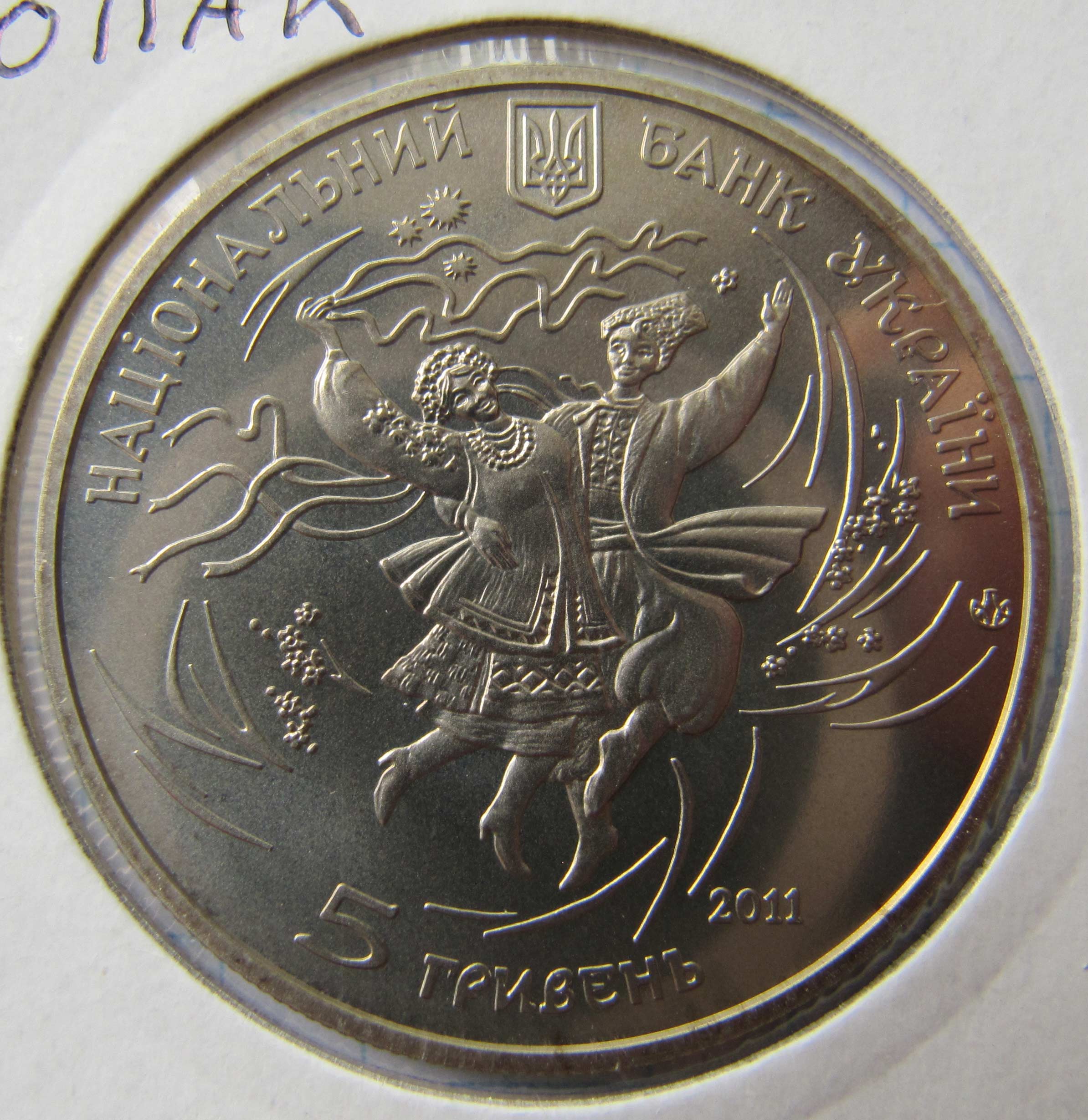 Аверс:изображена пара танцоров в стилизованном вихре танца. В верхней части монеты размещены малый Государственный герб Украины и надпись: "НАЦІОНАЛЬНИЙ БАНК УКРАЇНИ", внизу номинал 5 ГРИВЕНЬ и год чеканки монеты. Справа - логотип Монетного двора Национального банка Украины.