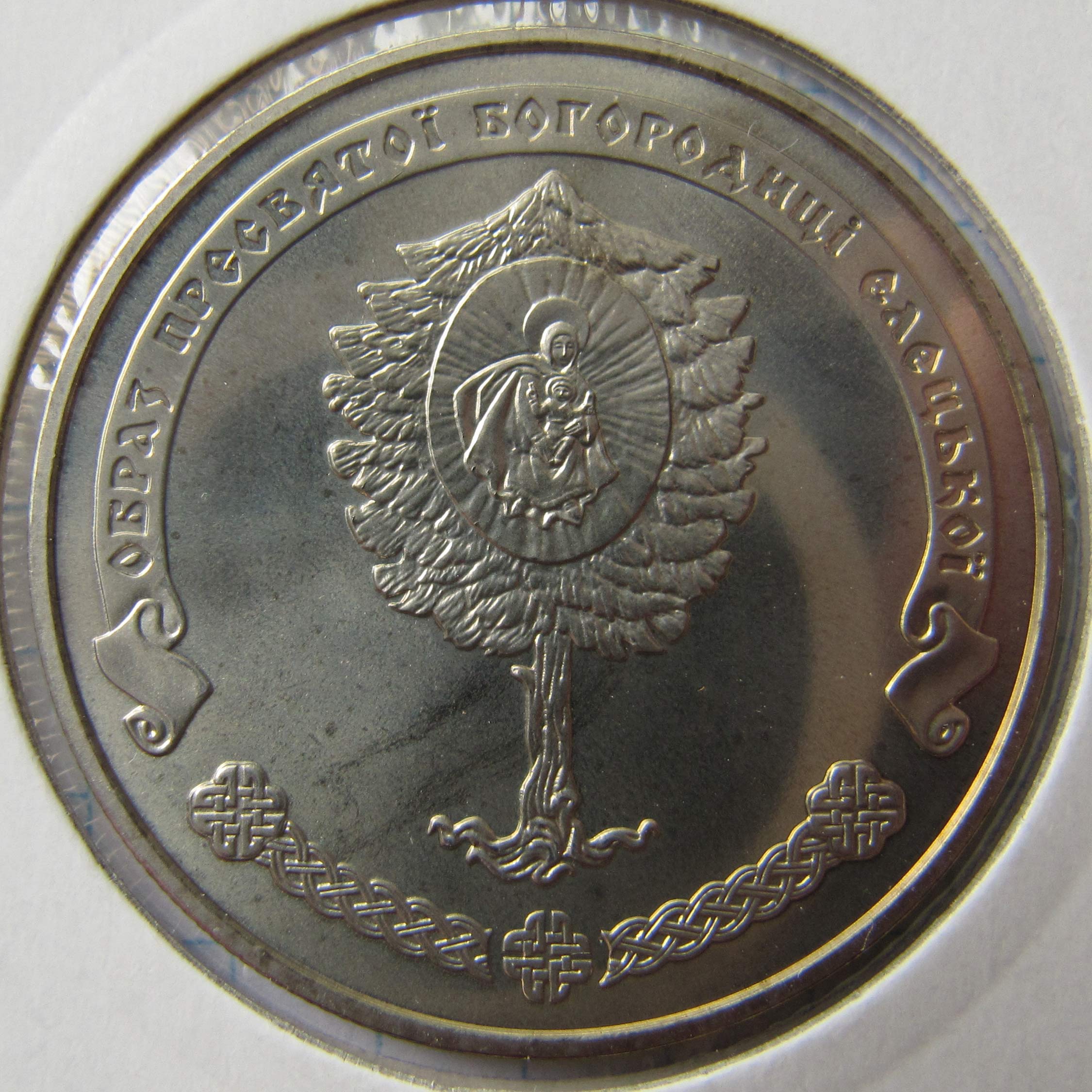 Реверс:стилизованное изображение иконы Божией Матери на ели. Вверху полукругом, на ленте надпись: "ОБРАЗ ПРЕСВЯТОЇ БОГОРОДИЦІ ЄЛЕЦЬКОЇ", внизу - стилизованный орнамент.