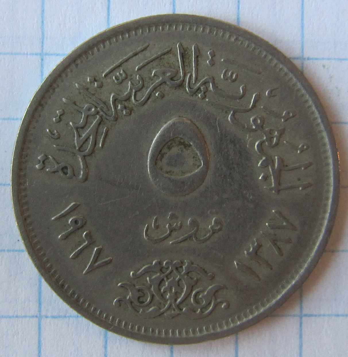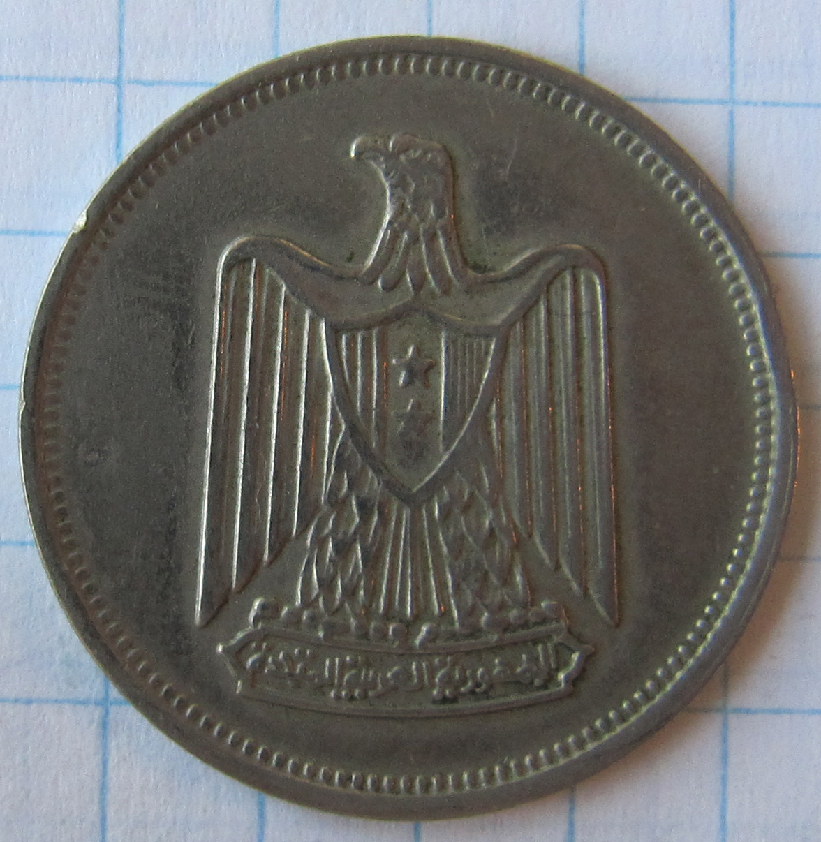 Реверс:герб страны: орел Саладина с прямыми крыльями, на груди щит с двумя вертикально расположенными звездами.