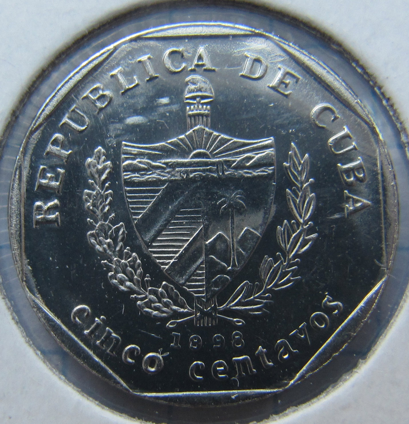 Реверс:герб Республики Куба. Вверху надпись: REPUBLICA DE CUBA, снизу - год чеканки монеты и номинал CINCO CENTAVOS.