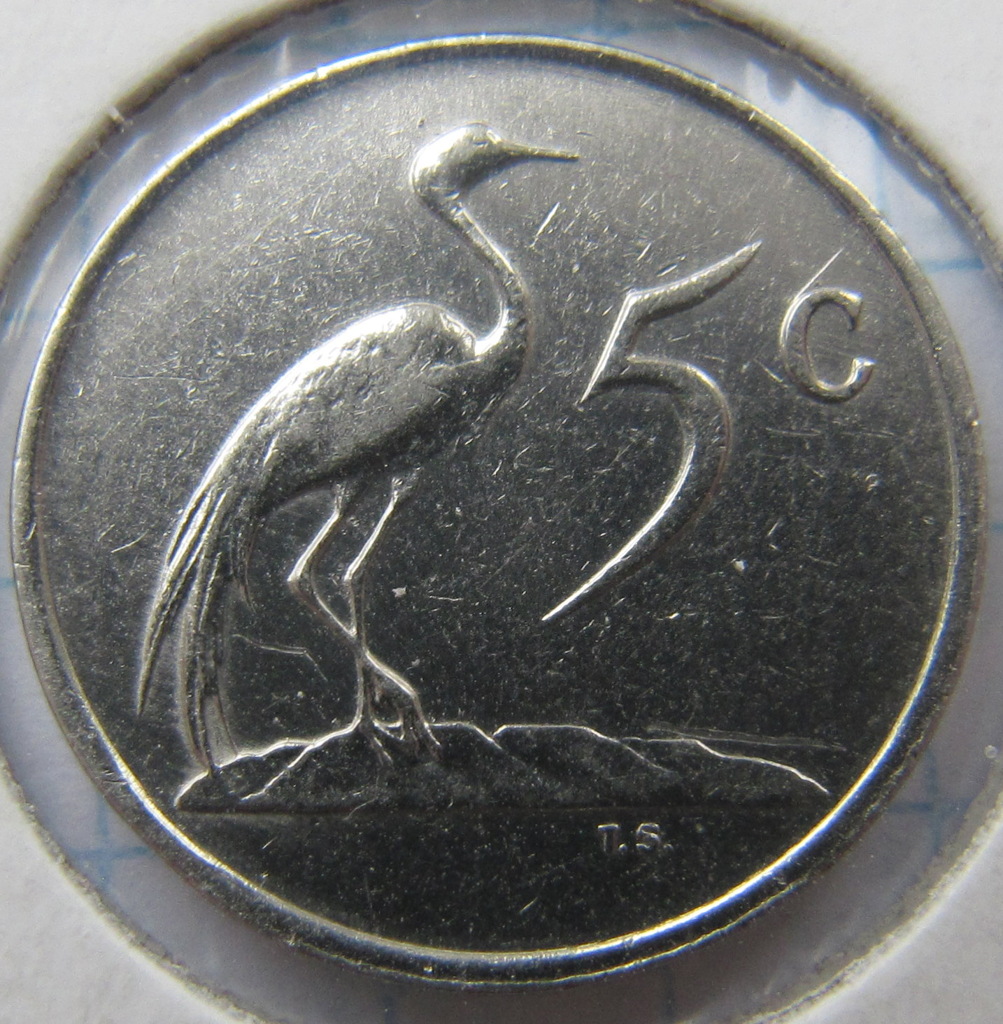 Аверс:номинал 5с и африканская красавка или райский журавль - птица высотой около 105 см. Также является одним из символов ЮАР.