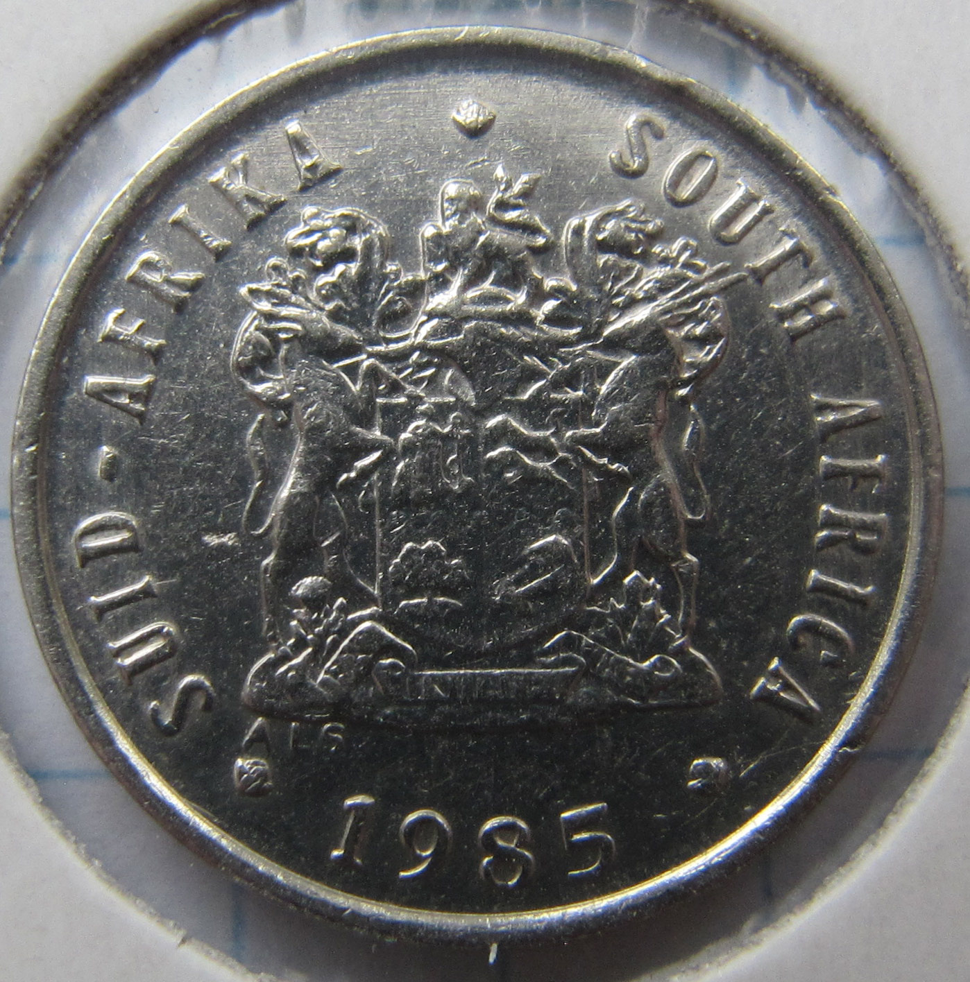 Реверс:герб ЮАР образца 1932-2000 гг. По бокам название страны на языке африкаанс SUID-AFRIKA и на английском языке SOUTH AFRICA. Снизу - год чеканки монеты.