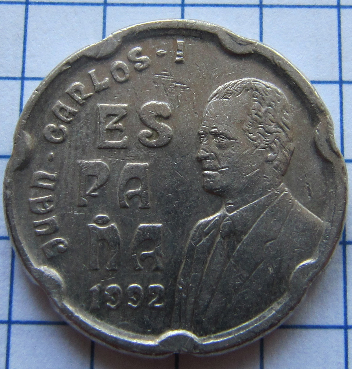 Реверс:Хуан Карлос I, слева надписи: JUAN CARLOS I, ESPAÑA и год чеканки.