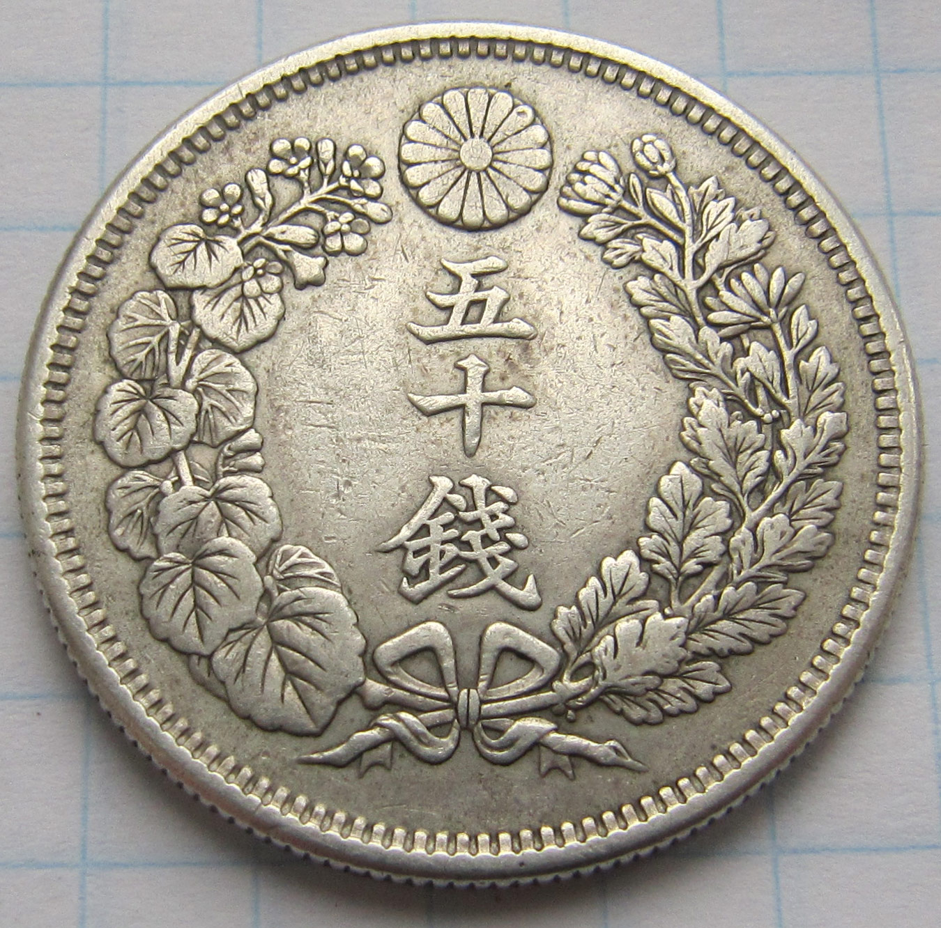 Реверс:в центре цветочного круга изображено абстрактное многолучевое солнце. Сверху по кругу иероглифы, переводящиеся как «Великая Япония», название эпохи и год чеканки монеты, снизу номинал монеты: 50 SEN.