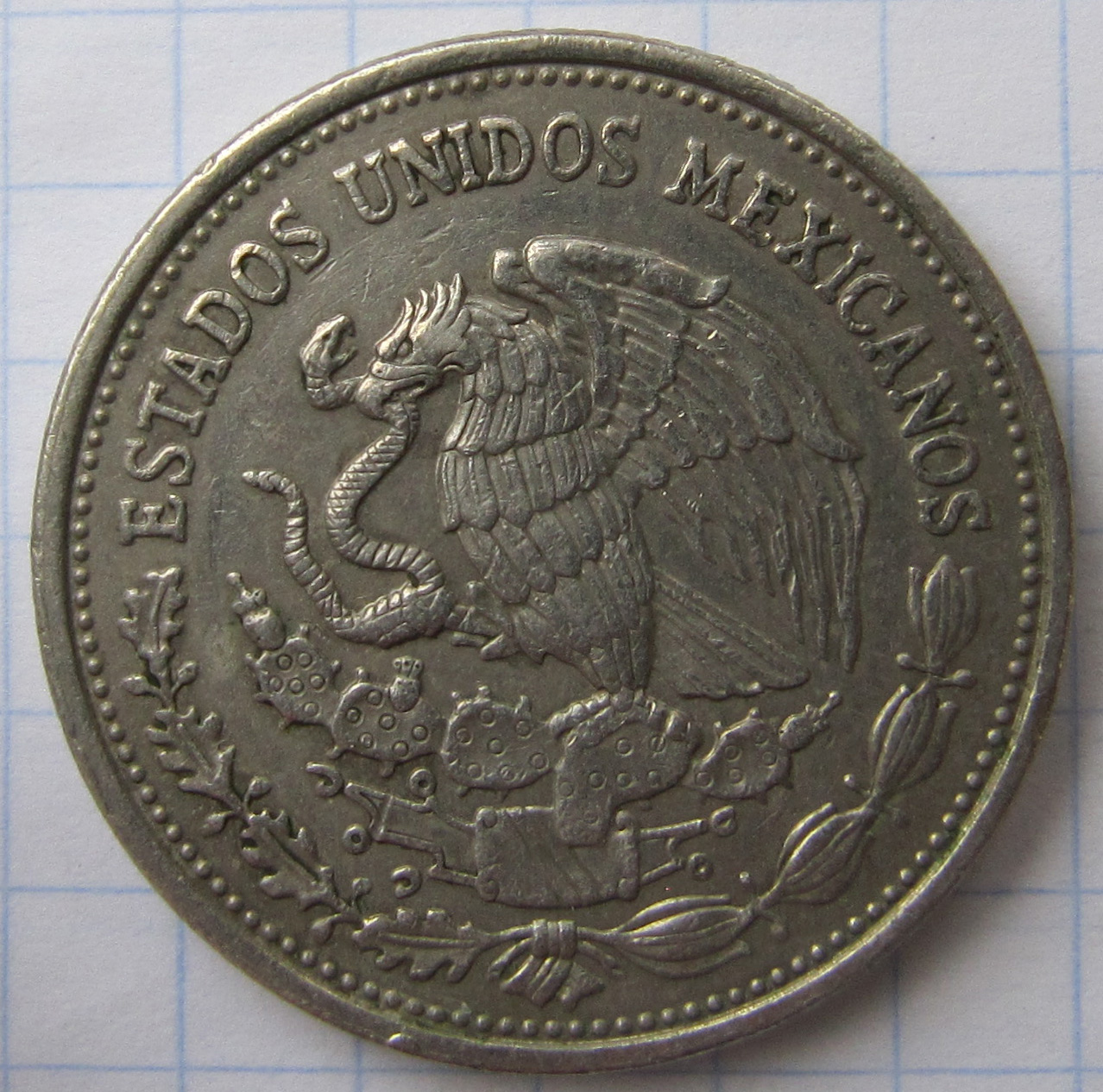 Реверс:в центре – герб Мексики: хохлатый сокол, сидящий на кактусе и держащий в клюве змею. В верхней части монеты надпись полукругом: ESTADOS UNIDOS MEXICANOS, в нижней – венок из ветвей лавра и дуба.
