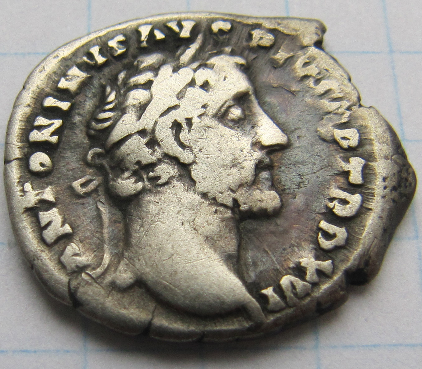 Аверс:ANTONINVS AVG PIVS PP TR P XVI. Голова лавреата вправо.