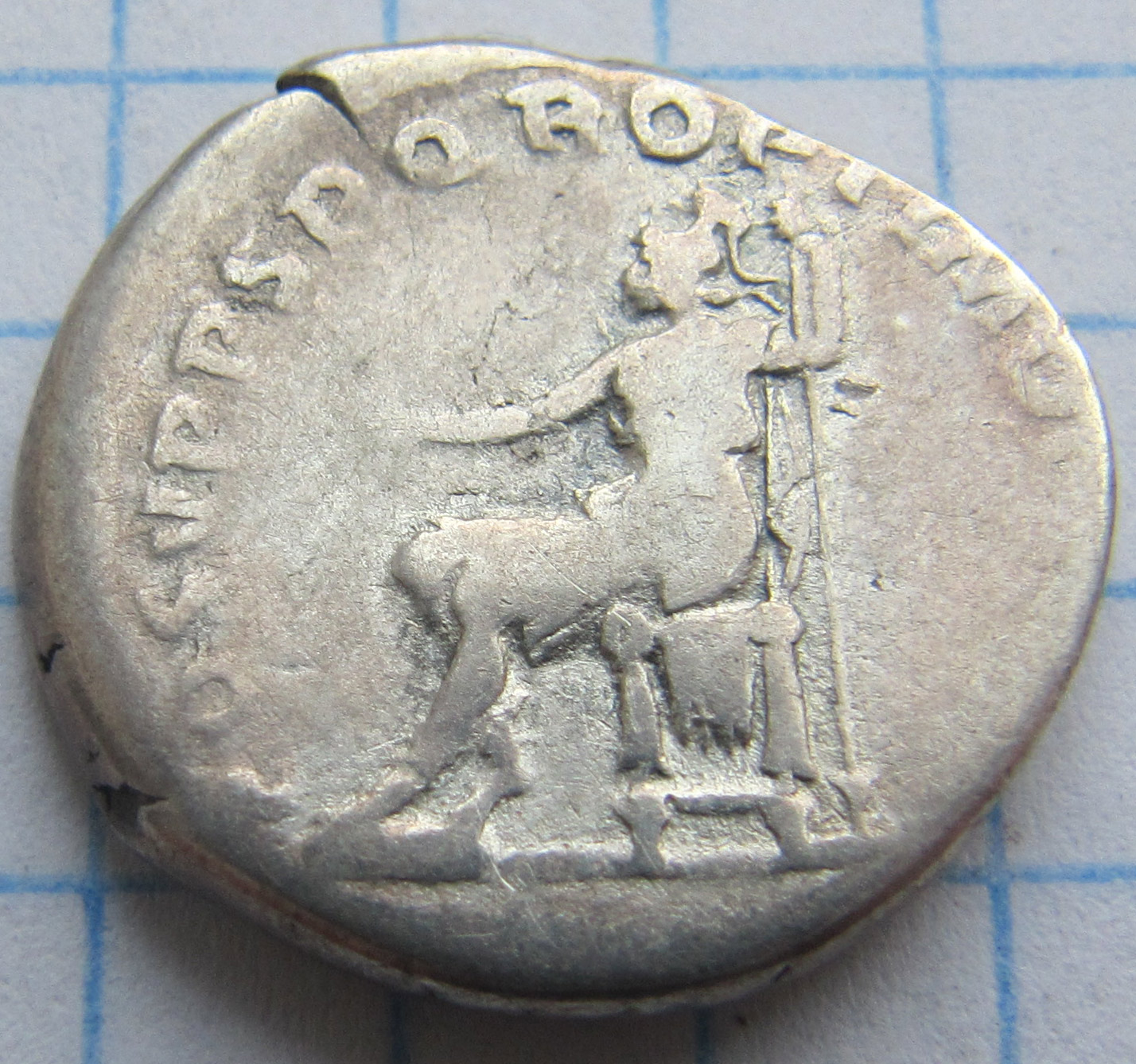 Реверс:COS V P P SPQR OPTIMO PRINC. Рома сидить вліво, тримає Вікторію і спис вістрям вниз.