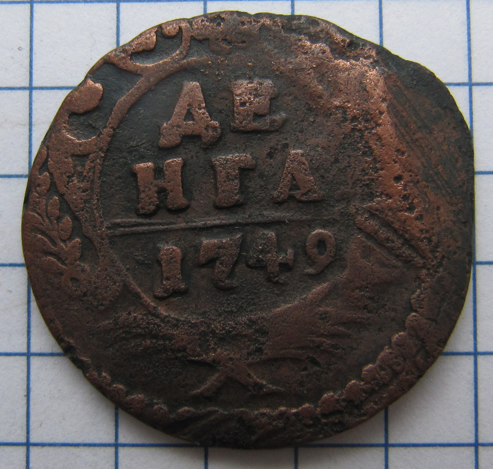 Аверс:шаблон №7, ДЕНЬГА, год чеканки монеты, розетка образца 1743г., шестилепестковая в форме цветка, цифра 9 в дате маленькая.