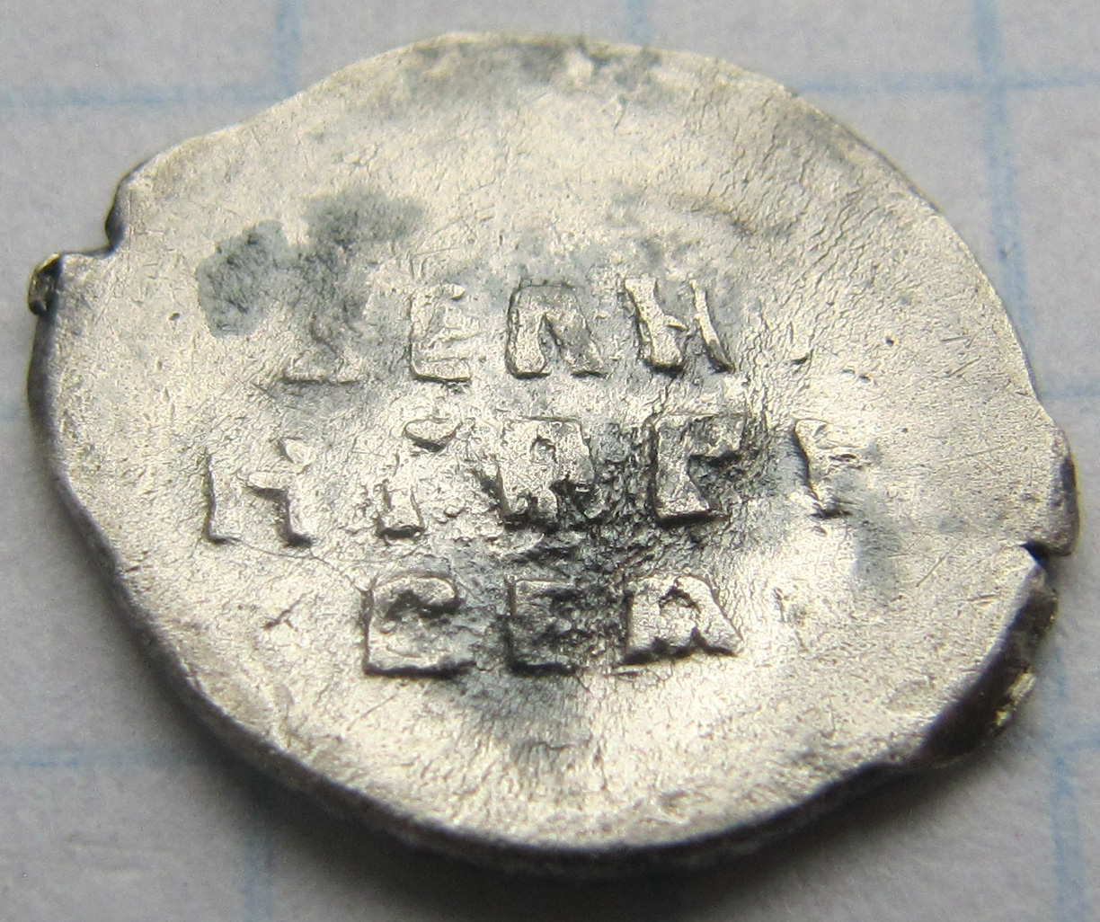 Аверс:надпись в пять строк, содержащая имя и титул правителя: КHАSЬ ВЕЛIK IN ГАРЬ ВСЕЯ РУСИ.