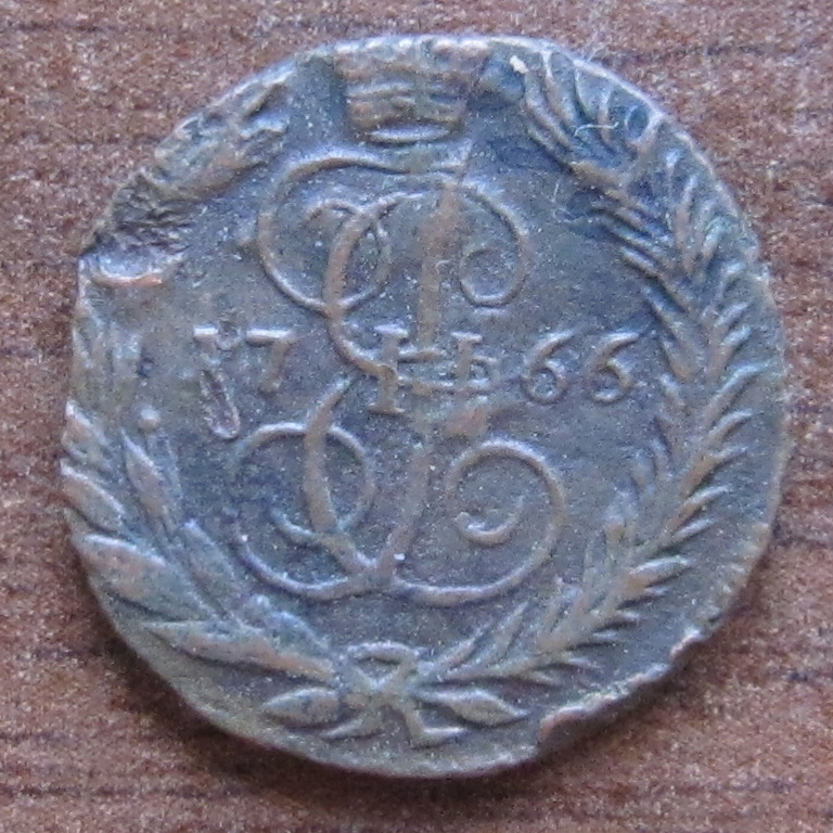 в центре монеты изображен вензель императрицы Екатерины II, над ним возвышается императорская корона, по сторонам вензеля год чеканки монеты, изображение окружено венком из лавровой и пальмовой ветвей, связанных внизу лентой.