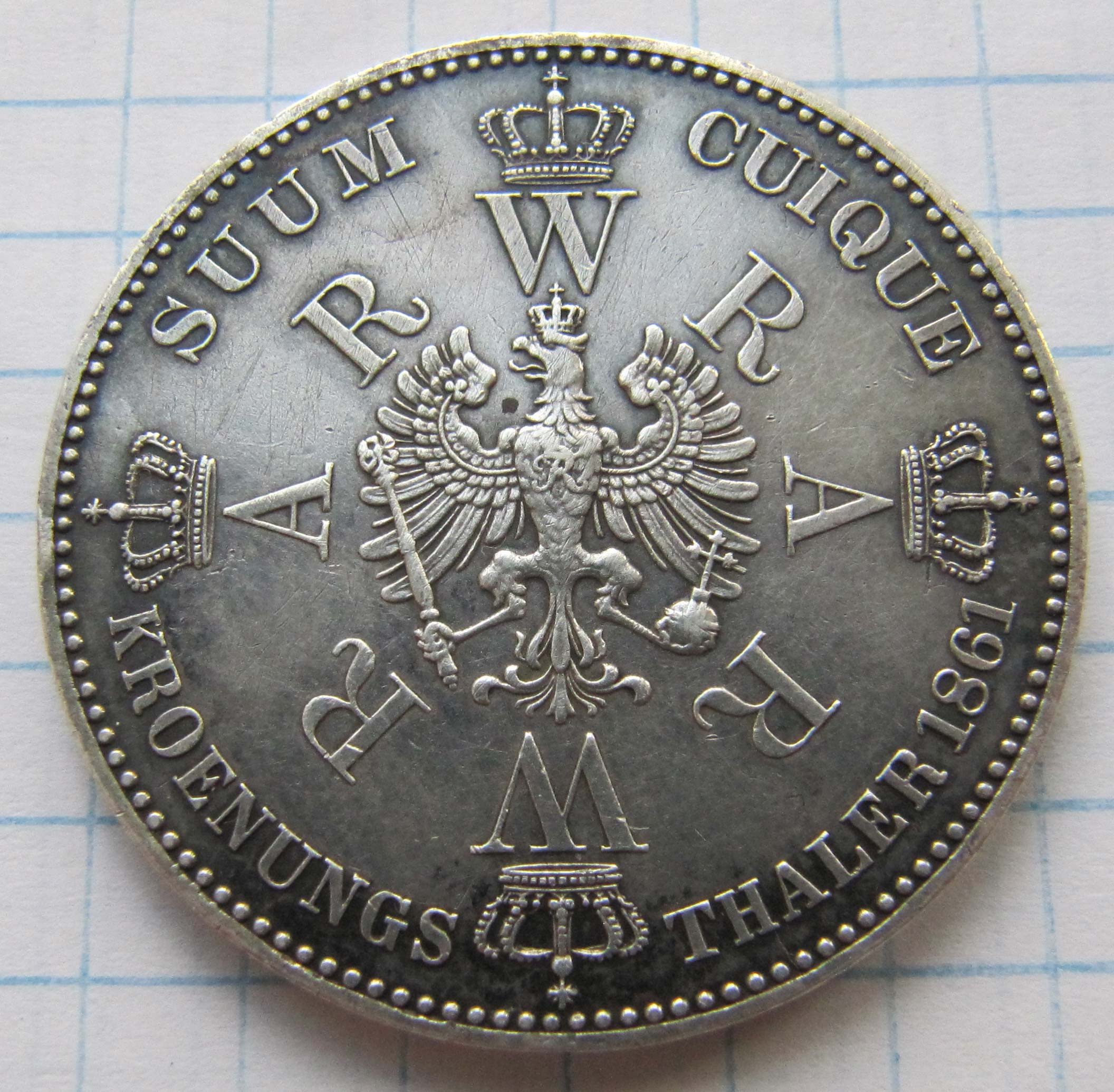 Аверс:герб Пруссии, по бокам от которого расположены первые буквы имён короля и королевы «W» и «A», увенчанные коронами. Круговая надпись «SUUM CUIQUE KROENUNGS THALER 1861» (Каждому своё Коронационный талер 1861).